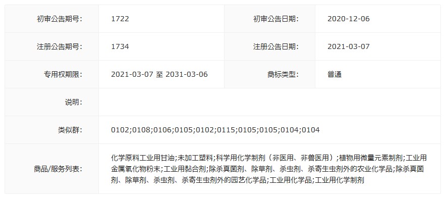 商品服务:化学原料工业用甘油;未加工塑料;科学用化学制剂(非医用、非兽医用);植物用微量元素制剂;工业用金属氧化物粉末;工业用黏合剂;除杀真菌剂、除草剂、杀虫剂、杀寄生虫剂外的农业化学品;除杀真菌剂、除草剂、杀虫剂、杀寄生虫剂外的园艺化学品;工业用化学品;工业用化学制剂