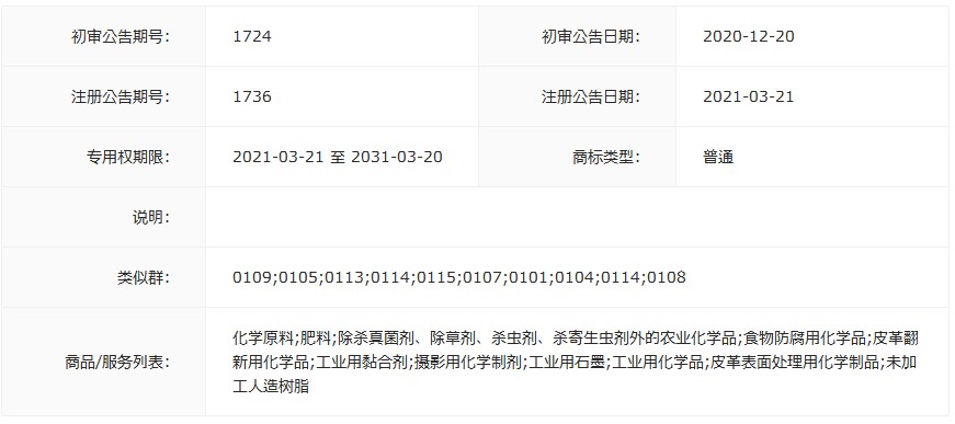 商品服务:化学原料;肥料;除杀真菌剂、除草剂、杀虫剂、杀寄生虫剂外的农业化学品;食物防腐用化学品;皮革翻新用化学品;工业用黏合剂;摄影用化学制剂;工业用石墨;工业用化学品;皮革表面处理用化学制品;未加工人造树脂