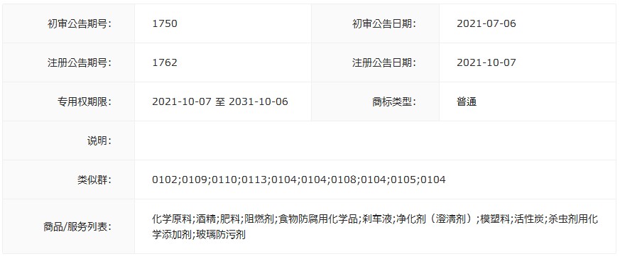 商标分类:第1类 化学原料 商品服务:化学原料;酒精;肥料;阻燃剂;食物防腐用化学品;刹车液;净化剂(澄清剂);模塑料;活性炭;杀虫剂用化学添加剂;玻璃防污剂
