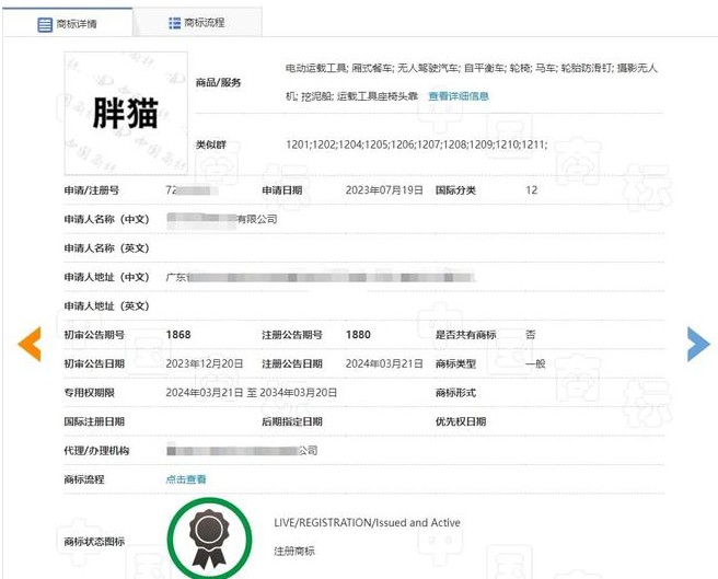 该公司早在23年7月就提交了注册申请,并且已经通过审核拿到该名称的商标权,很多小伙伴也私信我,像这种情况怎么避免,先说结论:其实为了整治这种行为,商标局会按照《商标审查审理指南》“囤商标”“傍名牌”“搭便车”“蹭热点”打击那些商标恶意抢注行为。因此,‘胖猫’作为热点事物,现在去作为商标申请,可能会被认定“蹭热点”从而驳回申请的。