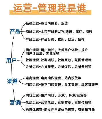 4. 运营:聚焦“管理我是谁”,是持续业务管理动作。涵盖产品、用户、渠道、营销等多维度运营,与用户互动并反馈问题,进行用户管理以拉长LTV。